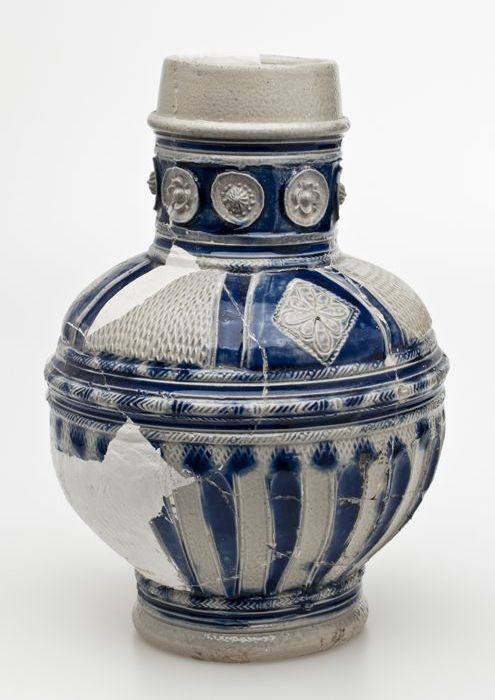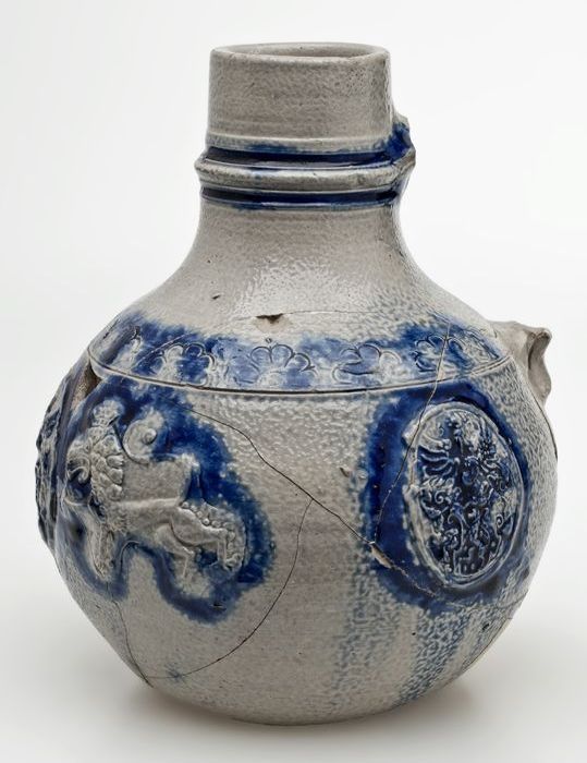 Westerwald kruik met gipsaanvulling, decors in blauw...