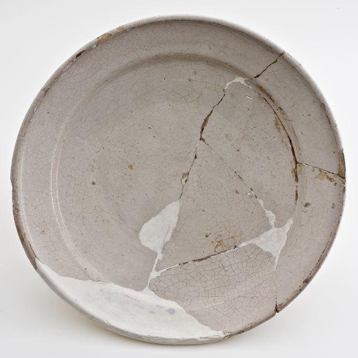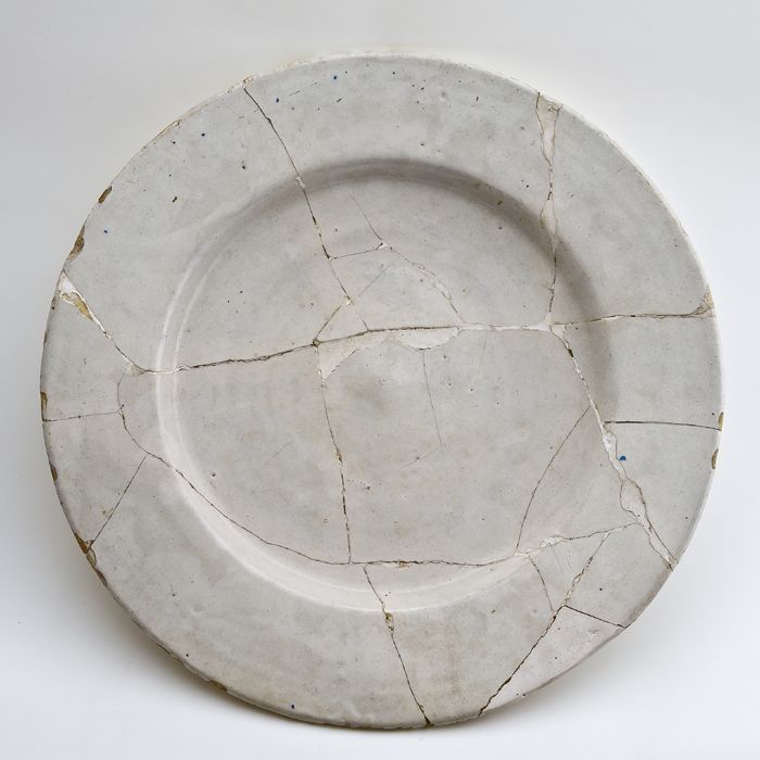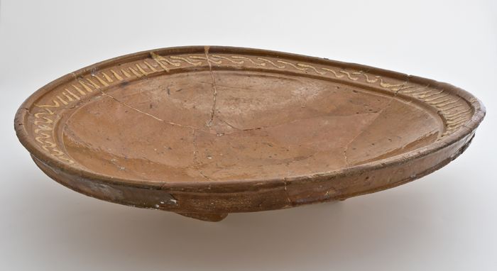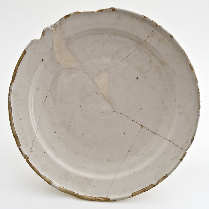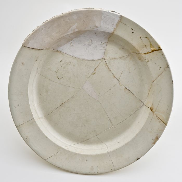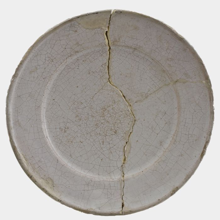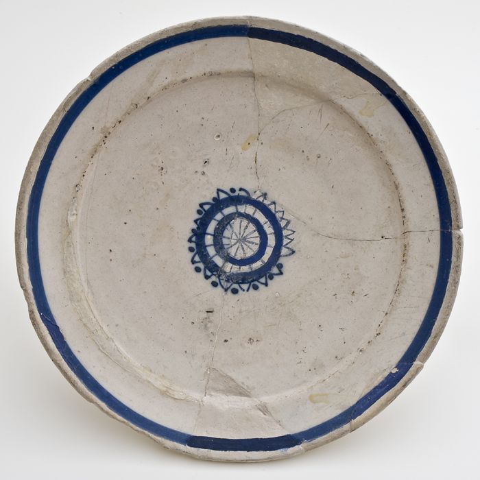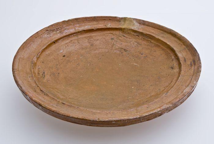 Aardewerk plaat of deksel van spreeuwenpot, geheel g...
