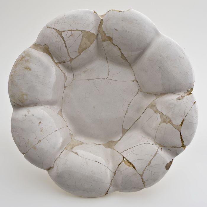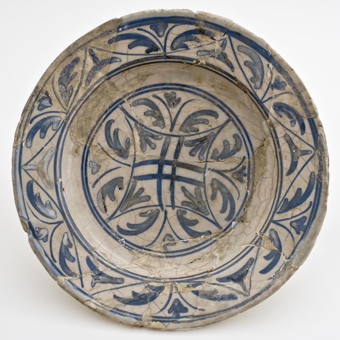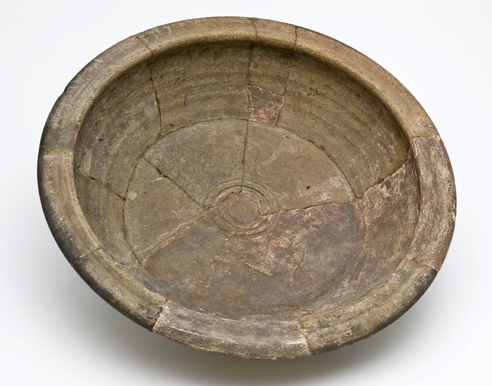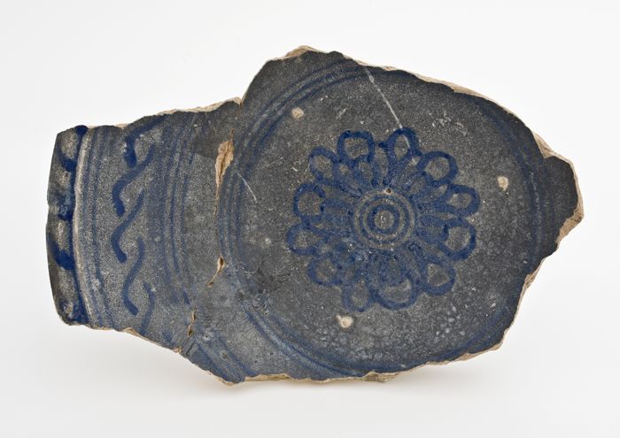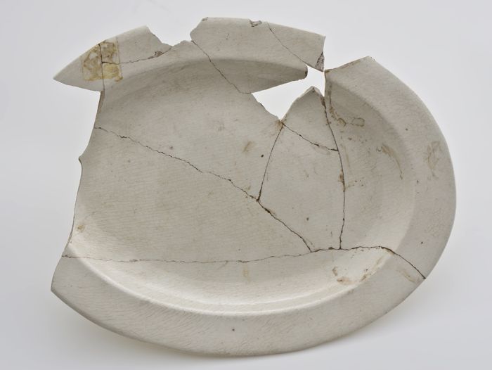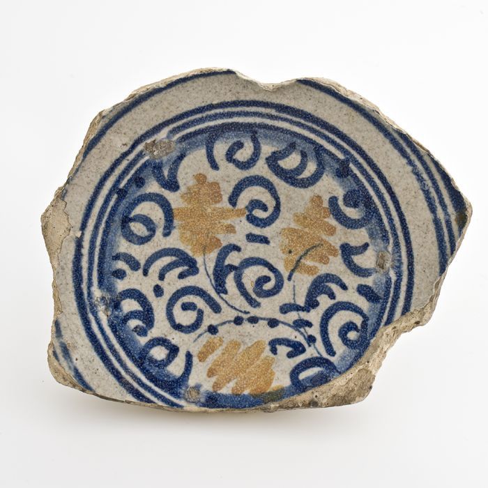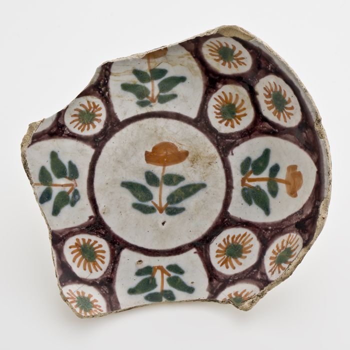 Aardewerk plaat of deksel van spreeuwenpot, geheel g...