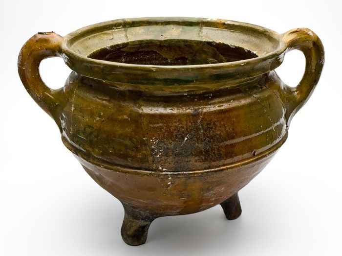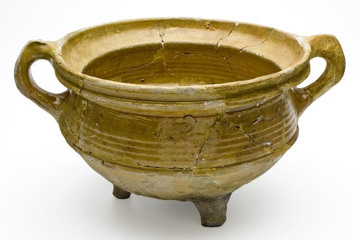 Gele kookpot op drie poten, met twee ingeknepen staa...