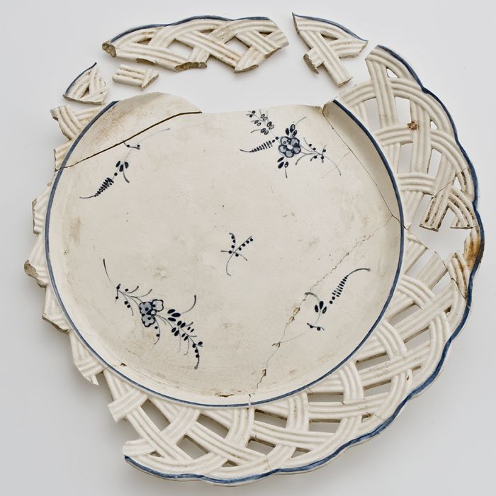 Fragmenten bord, ajour rand met vlechtwerk, blauwe s...