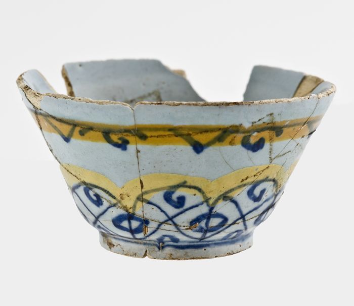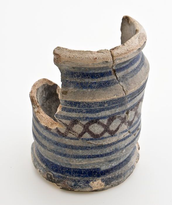Fragment majolica zalfpot, albarello, lijn- en ruitd...