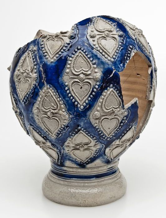 Fragment Westerwald kruik, appliqué's met twee harte...