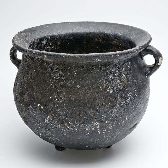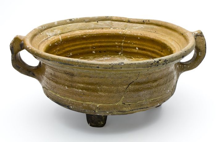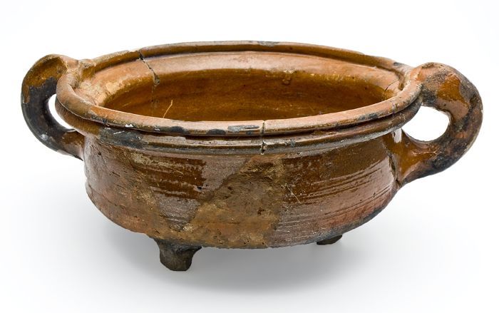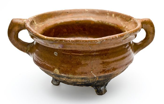 Kookpot van rood aardewerk, op drie poten, twee vert...