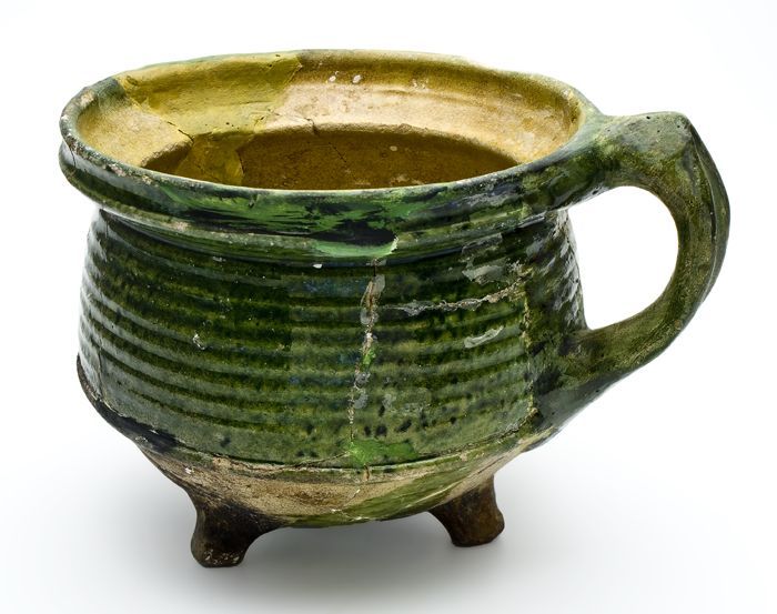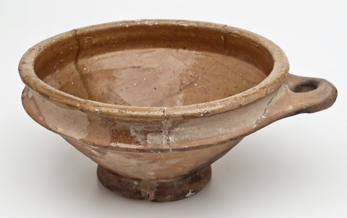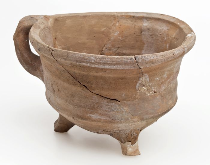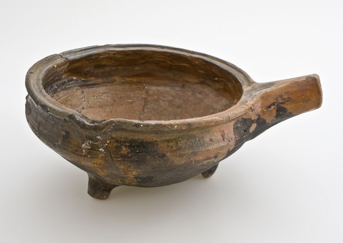 Aardewerk steelpan op drie poten, met schenktuit en ...