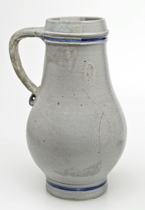 Grijze steengoed kan met oor, blauwe banden om hals ...