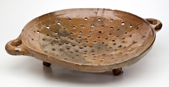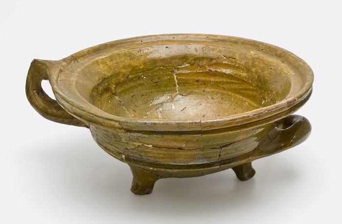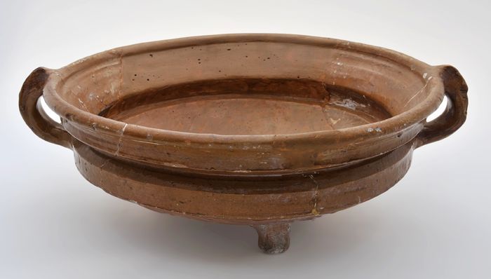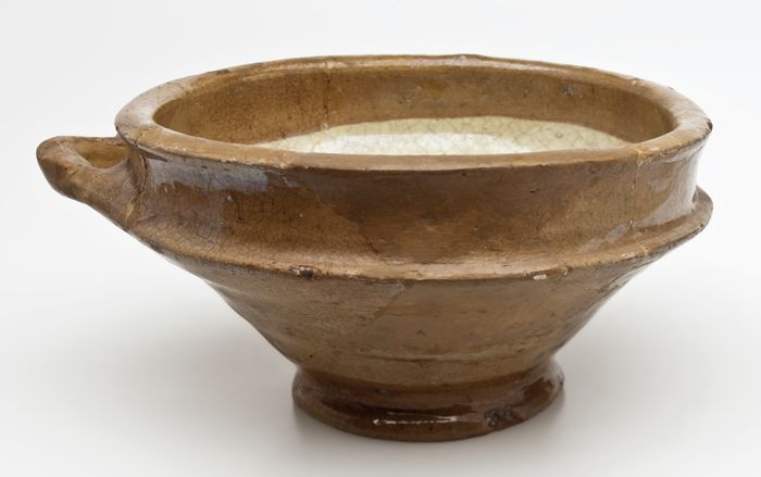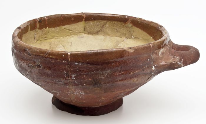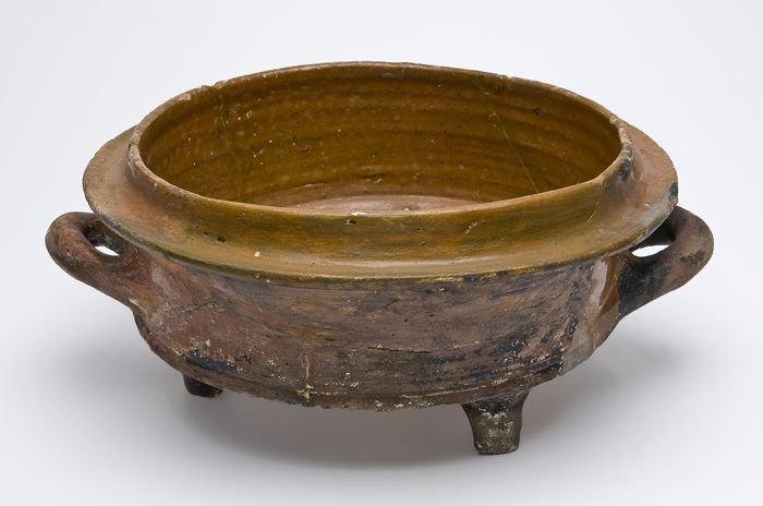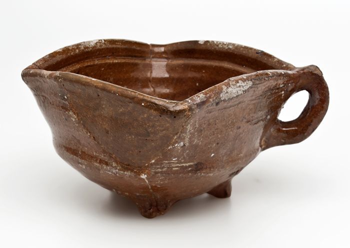 Aardewerk vergiet, komvormig op drie poten, rode sch...