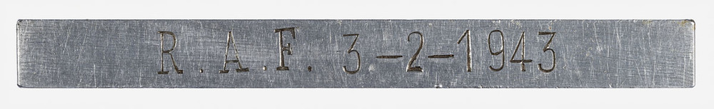 metalen balkje met daarop de tekst: R.A.F. 3-2-1943