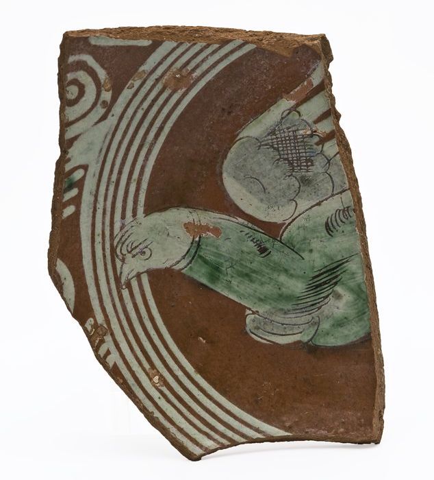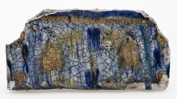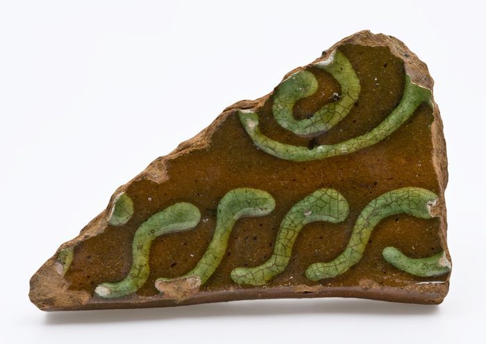 Fragment aardewerk tegel met gevlekt patroon in paar...