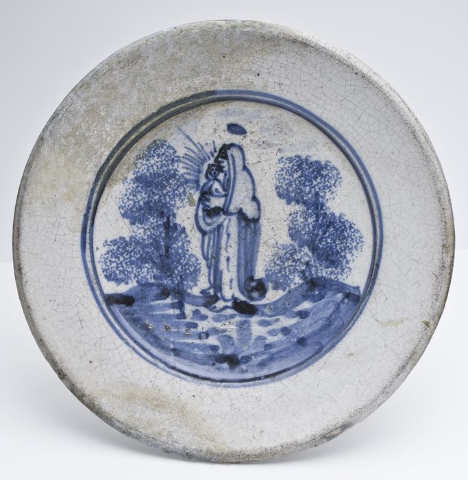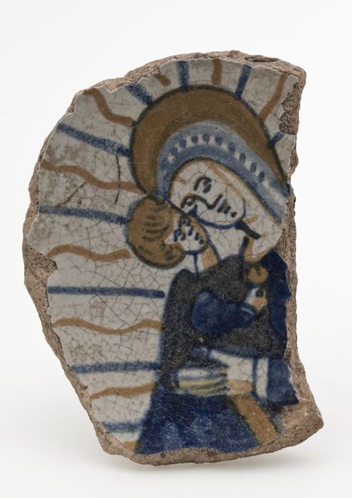 Fragment polychrome majolica schotel met Maria en Ch...