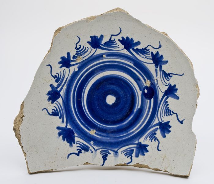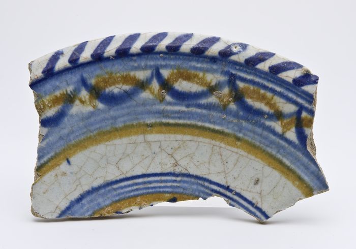 Fragment van majolica schotel met kransdecor in de vlag