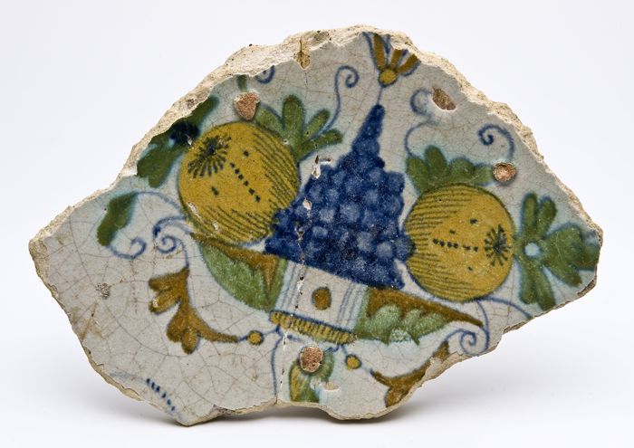Randfragment van majolica schotel met polychroom fru...