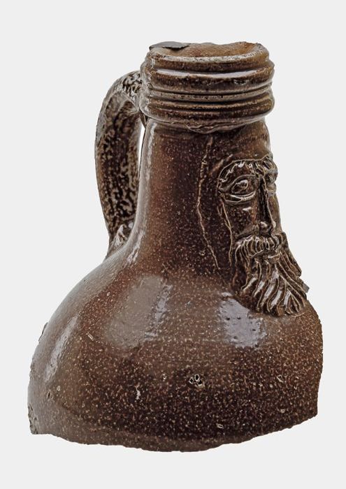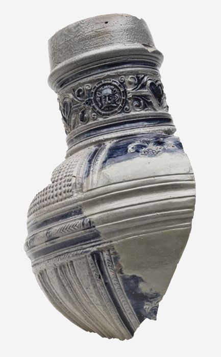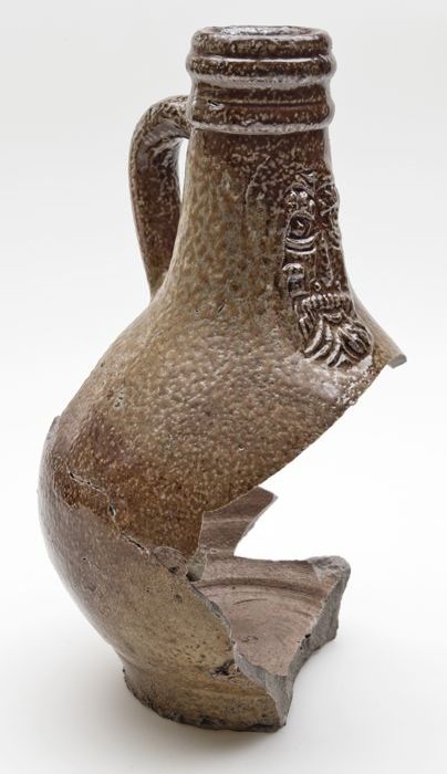 Fragmenten van grote steengoed baardmankruik met car...