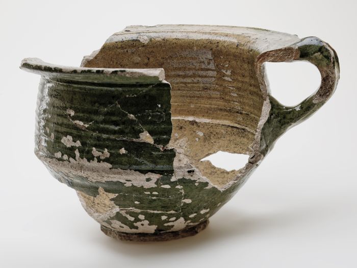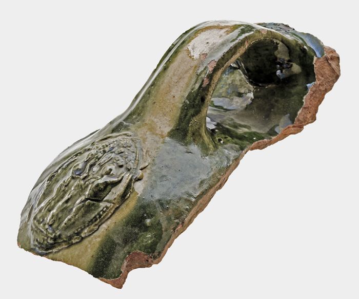 Aardewerk fragment met oor en cartouche, groen en ge...