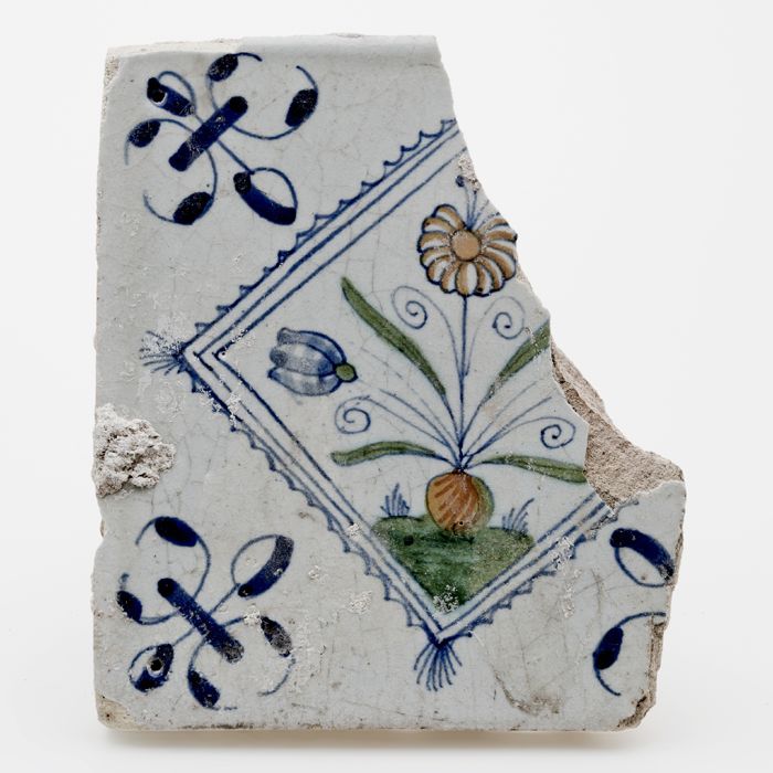 Fragment aardewerk kwadraattegel met polychrome bloem