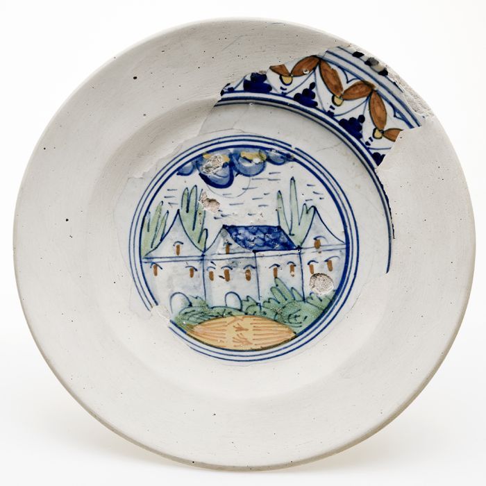 Aangevuld majolica bord met polychroom landschap met...