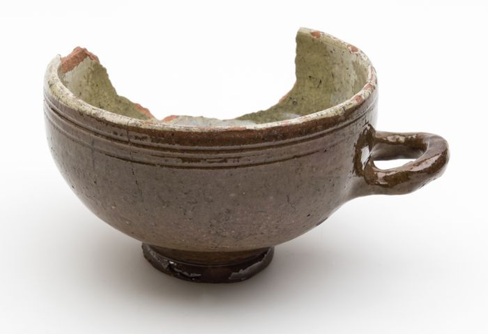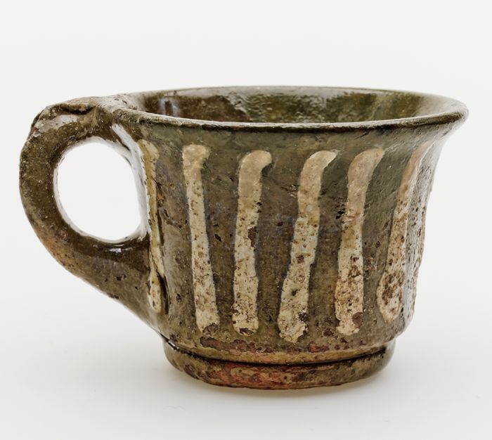 Aardewerk kop met bandoor, versierd in slibtechniek