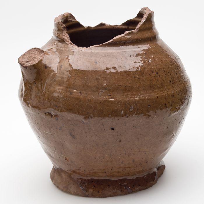 Aardewerk pot, test met gaten in bodem, buikig model...