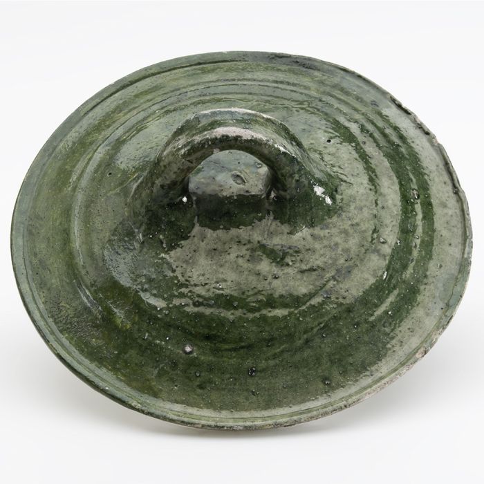 Groene kookpotdeksel met gebogen plat oor in het mid...