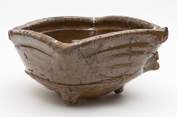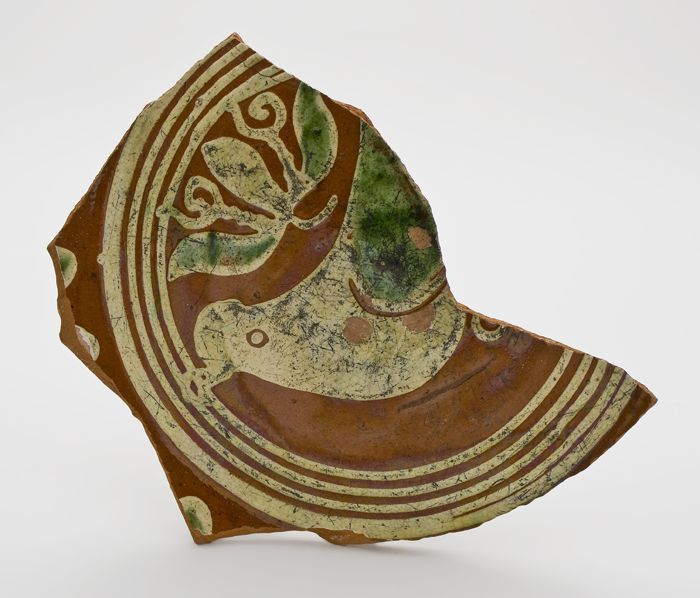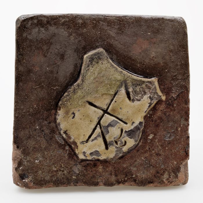 Plavuis, bruin geglazuurd met geel schild met merkteken