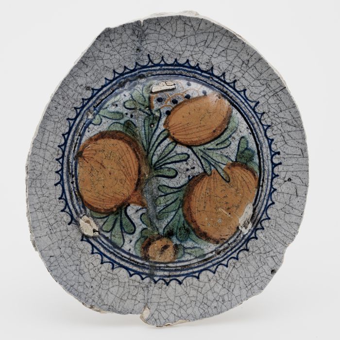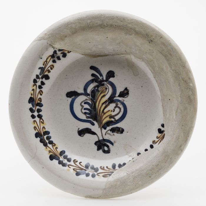 Fragment van een majolica schotel waarop een plant