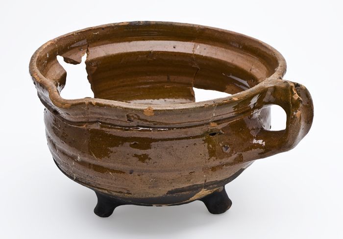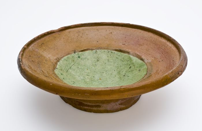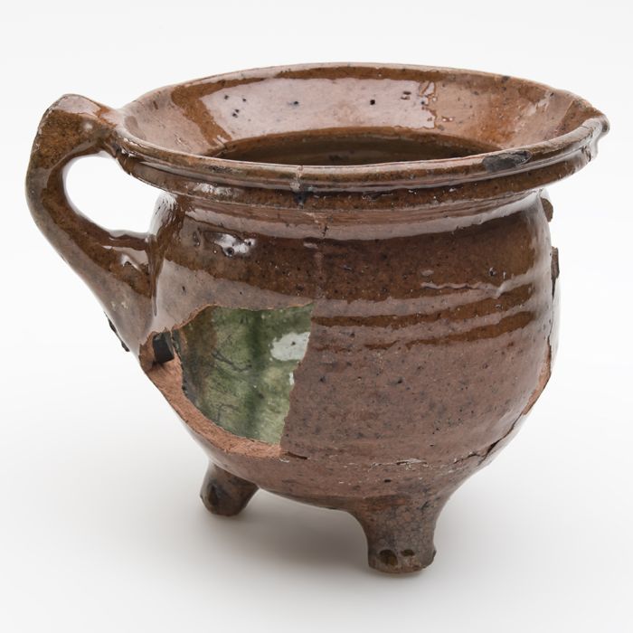 Aardewerk kan, rode scherf, geheel geglazuurd, op st...
