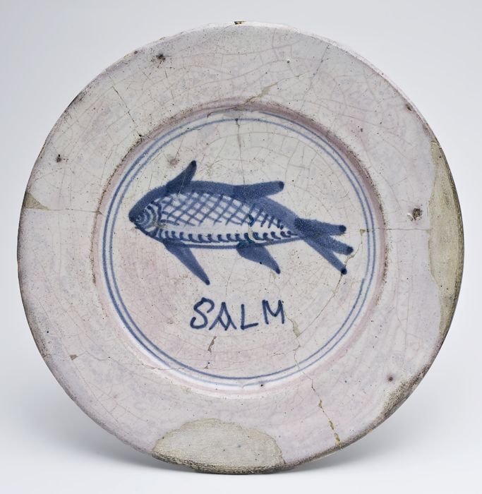Ziel van majolica schotel met omkranste blauwe cirke...