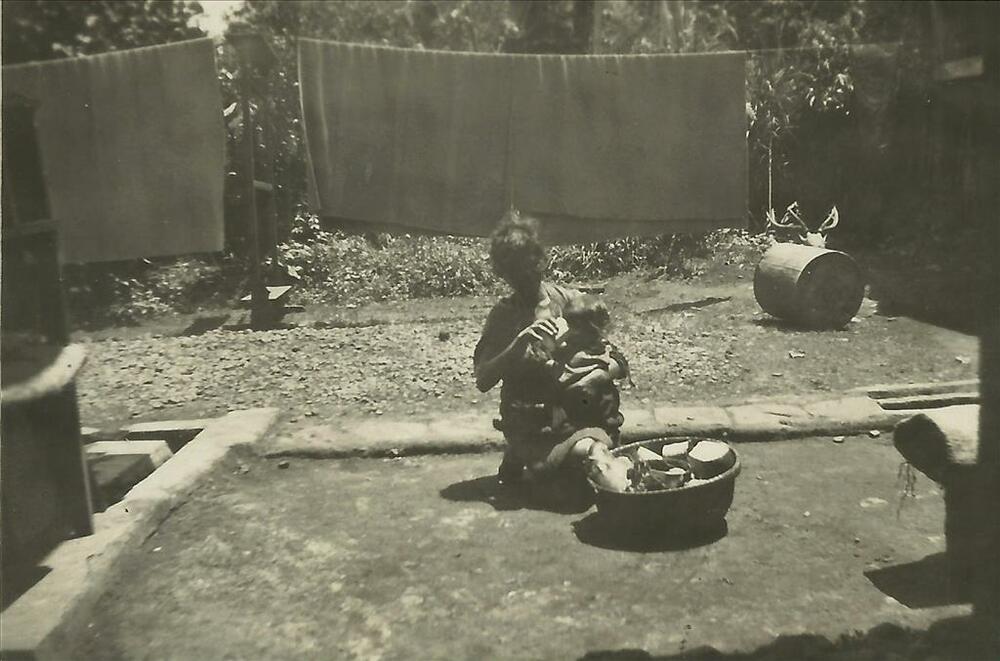 Nederlands Indië; moeder met kind, mand, etenswaar, ...