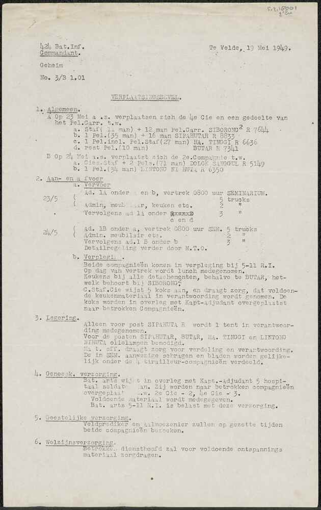 Brief van commandant 424 Bataljon Infanterie over ve...