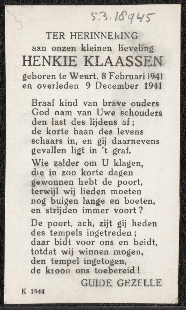 bidprentje Henkie Klaassen