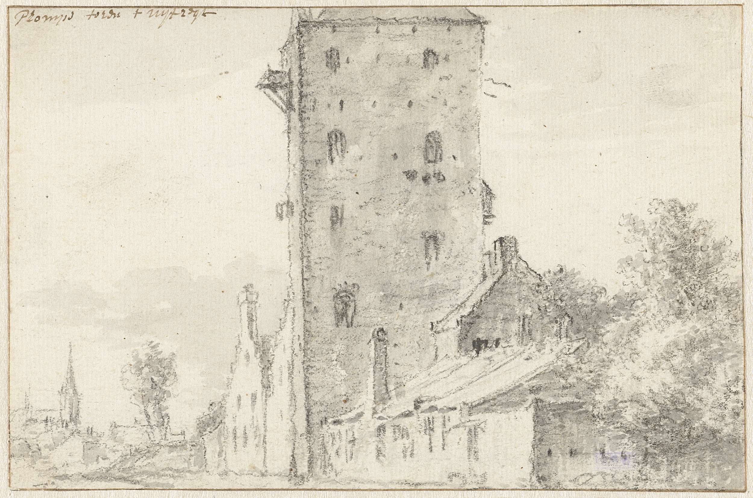 Gezicht op huizen en vestingstoren aan het water