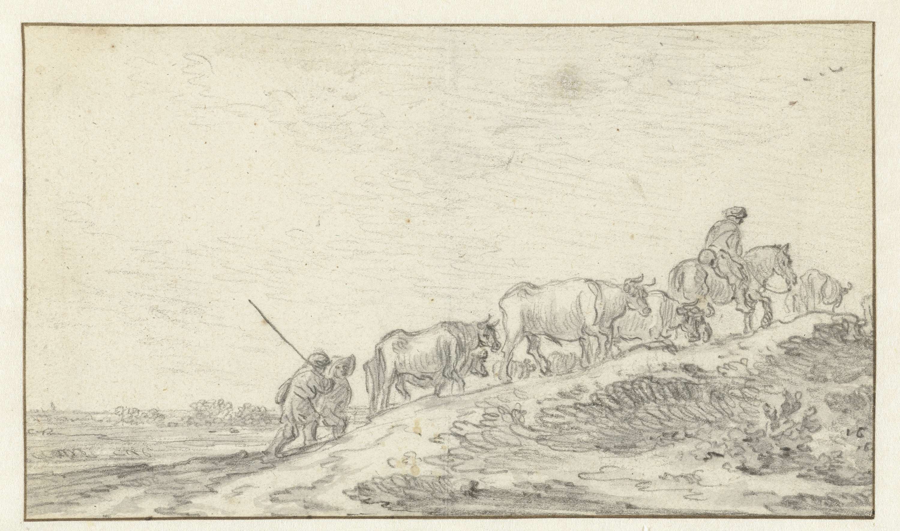 Gezicht op een oever met herders en vee