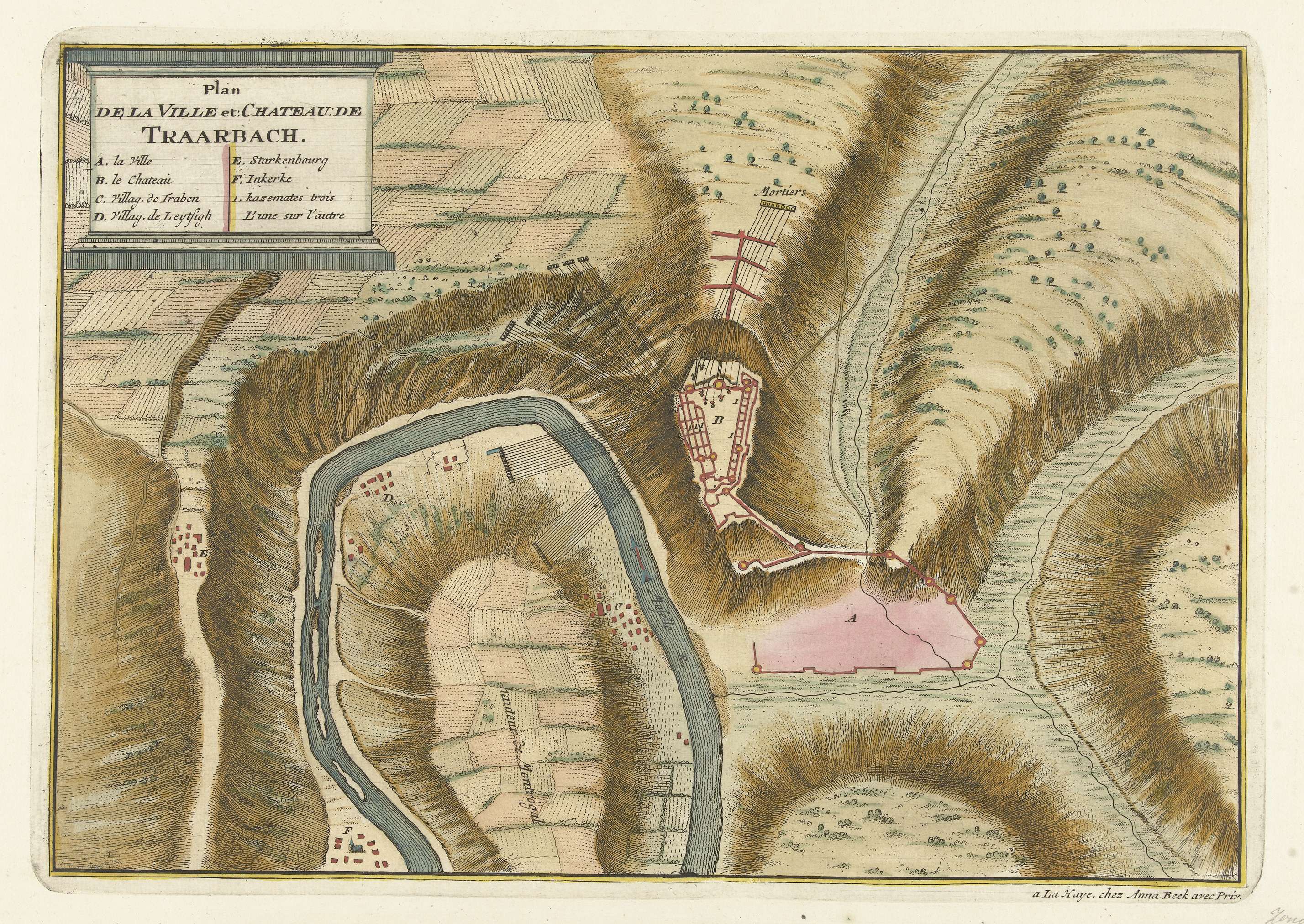 Plattegrond van dorp en kasteel van Trarbach, 1704
