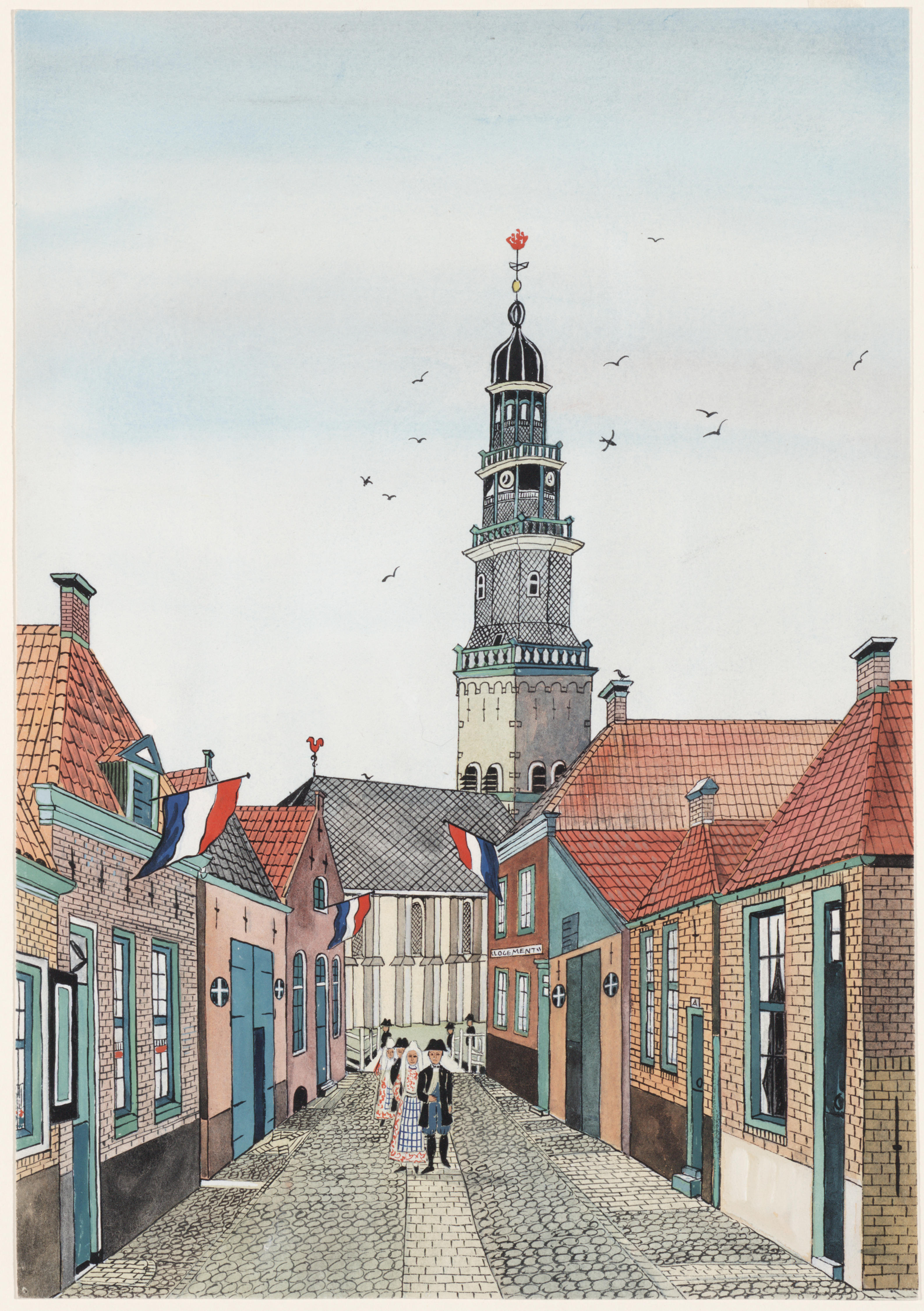 Gezelschap in de dracht van Noord-Holland voor de ka...