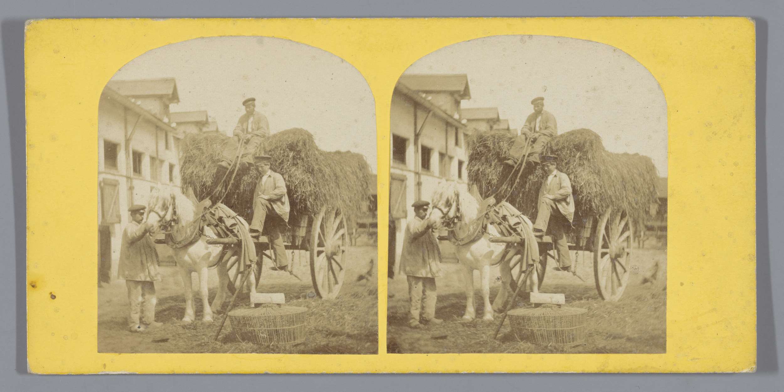 Drie mannen bij een hooiwagen, waarschijnlijk in Fra...