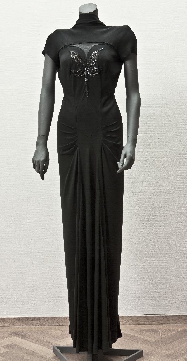 Avondjurk van zwart zijden crêpe met incrustaties va...