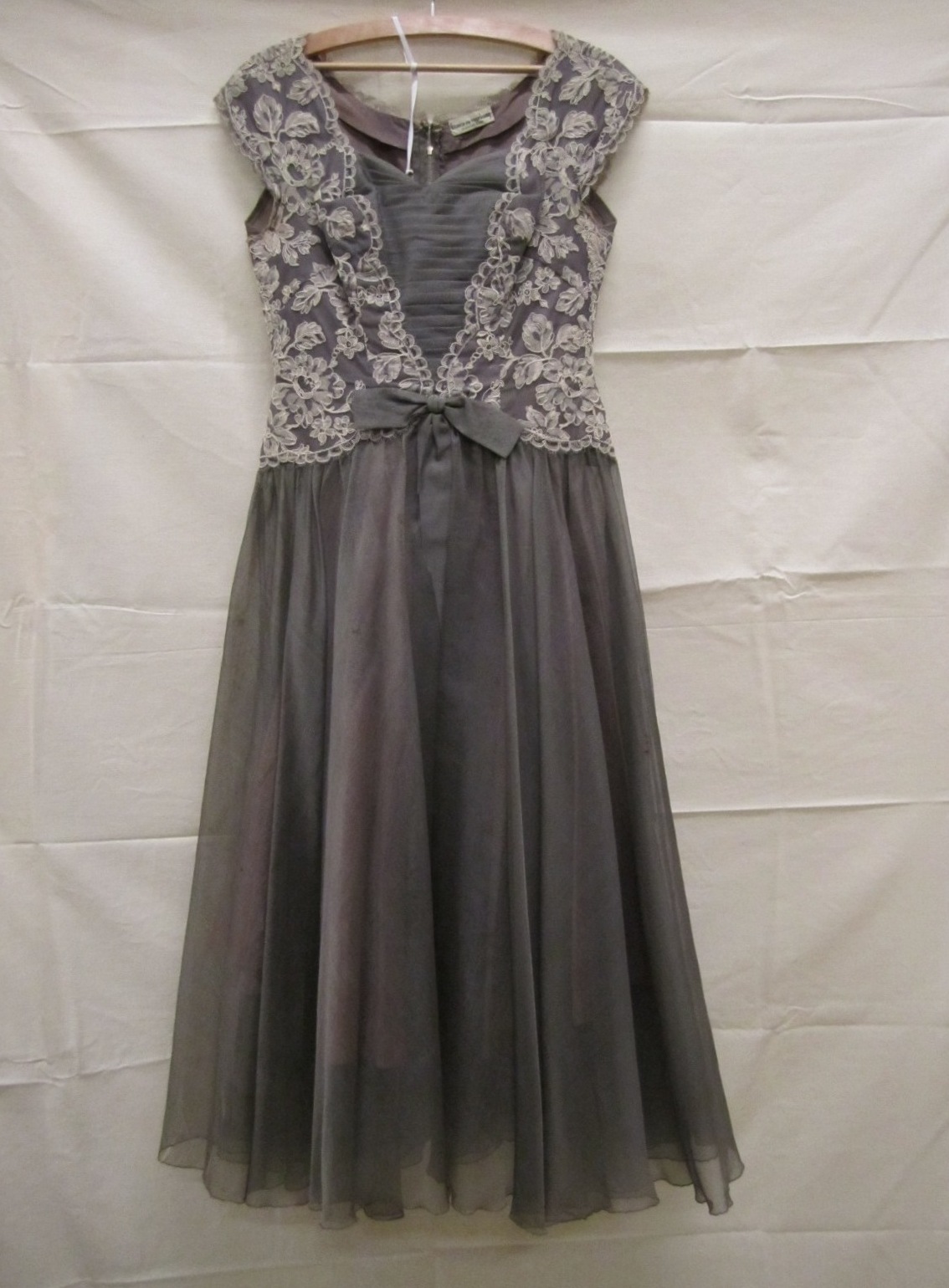 Avondjurk van grijs zijden gaas, garnering op het li...
