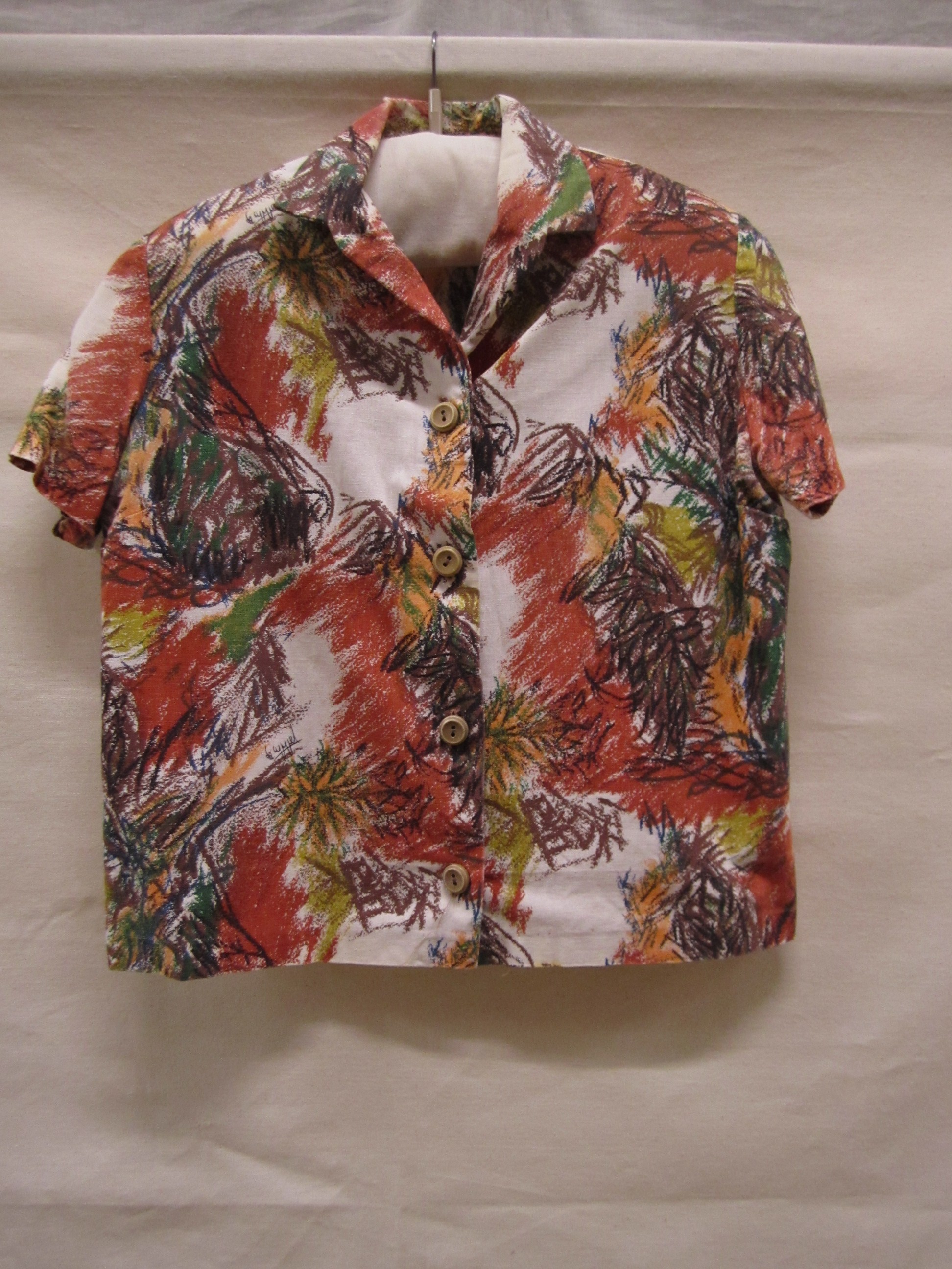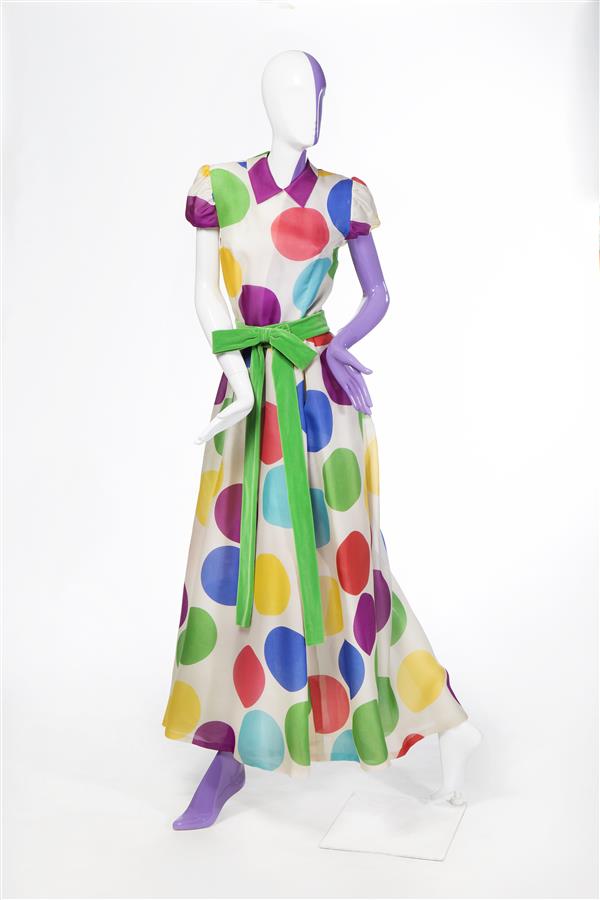 Avondjurk van witte (kunst?)zijde, bedrukt met grote...