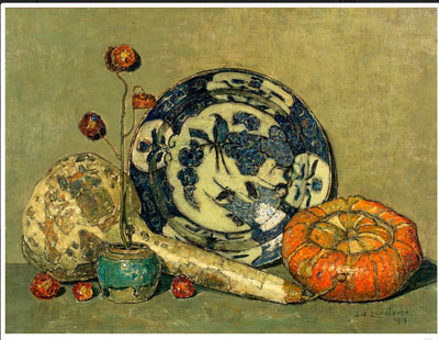 Stilleven: delfts blauw bord, pompoen, kaars(?) en p...