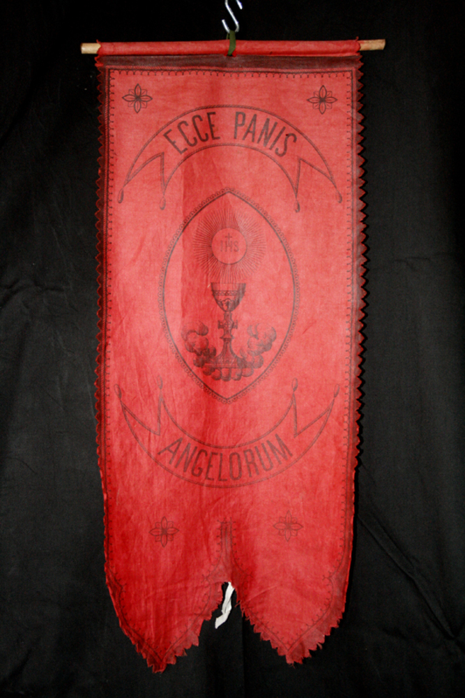 Vaandel met kelk en hostie in zwartdruk op rode stof...