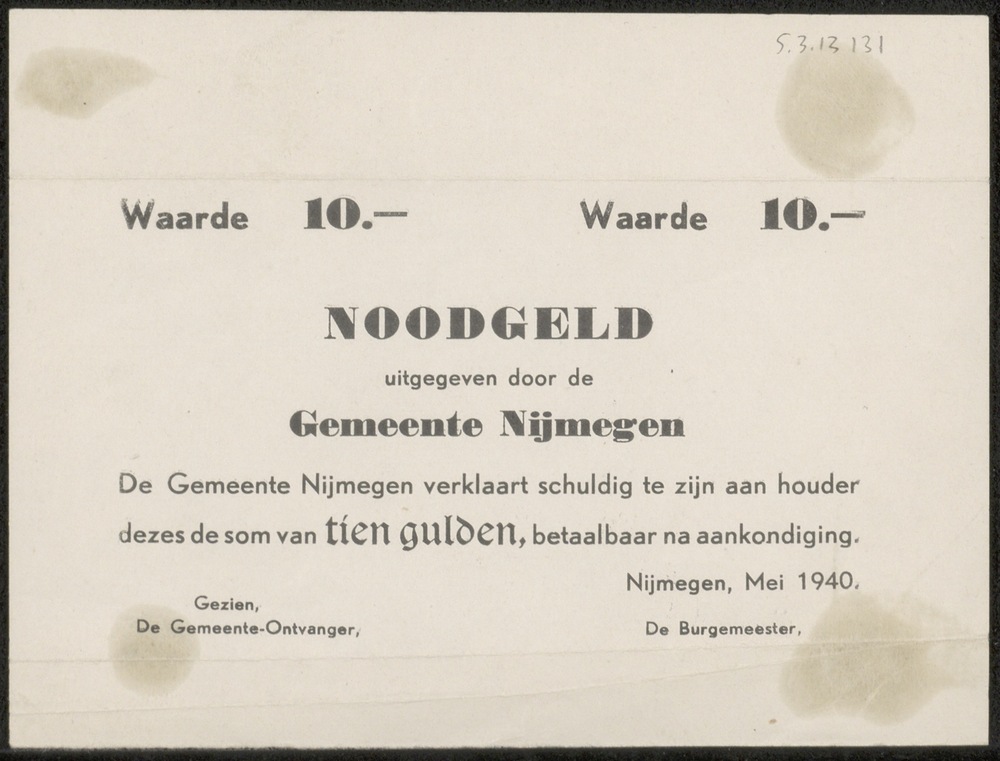 Bankbiljet noodgeld gemeente Nijmegen, 10 gulden, me...