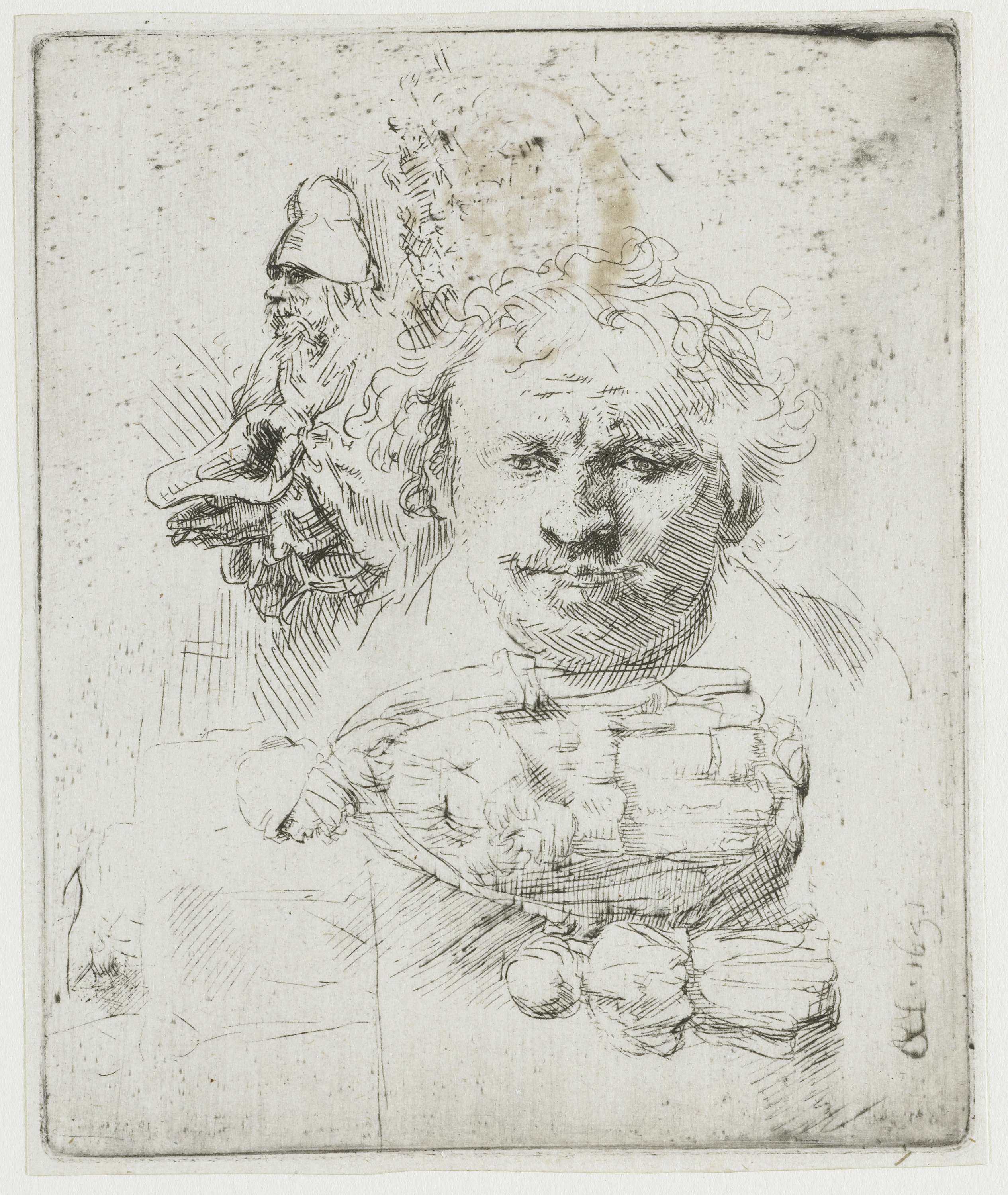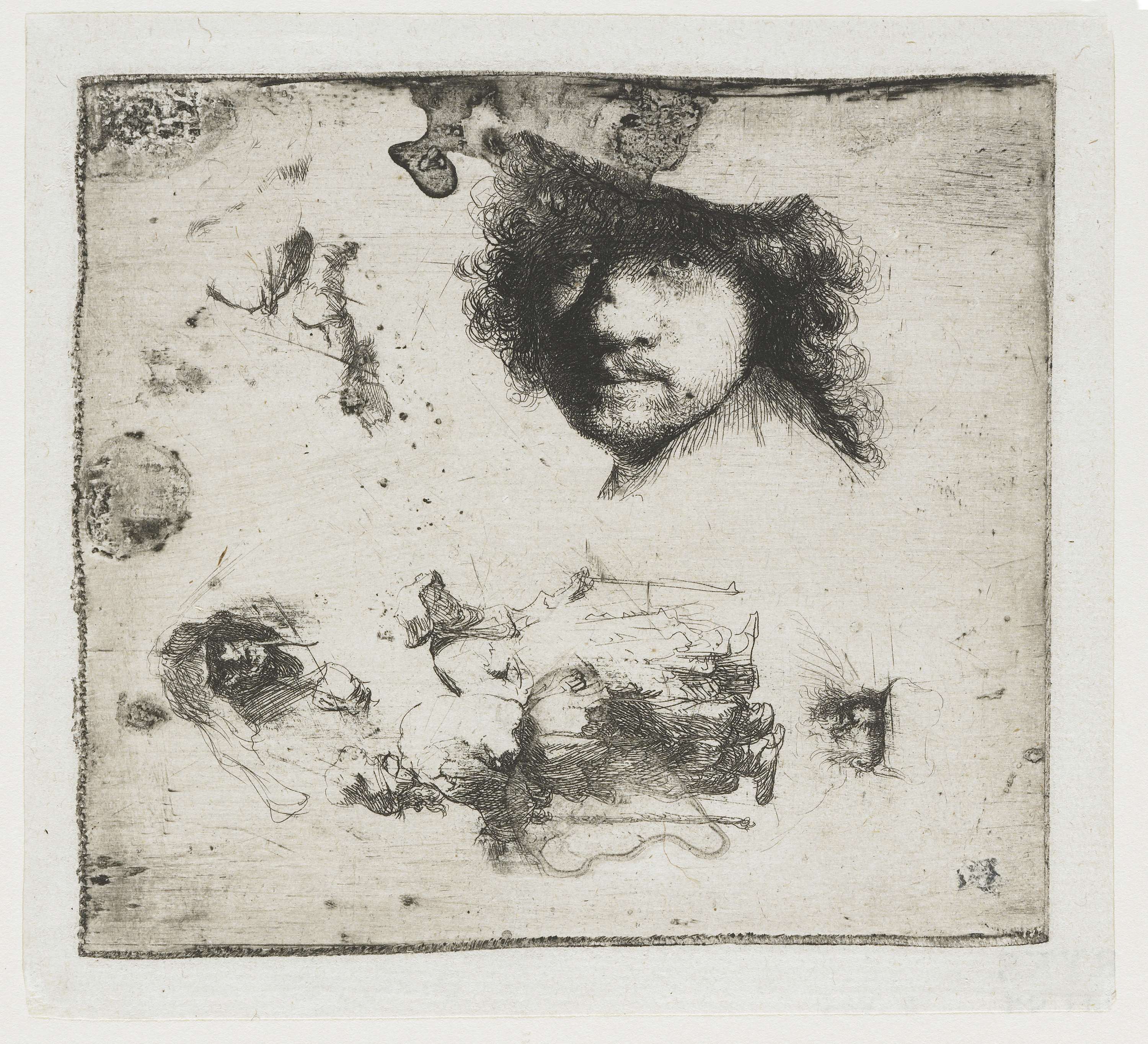Studieblad met zelfportret, een bedelaarspaar, en ho...
