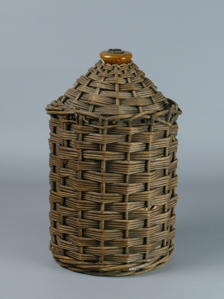 Flesje van kleurloos glas met kroonkurk, inhoud mine...