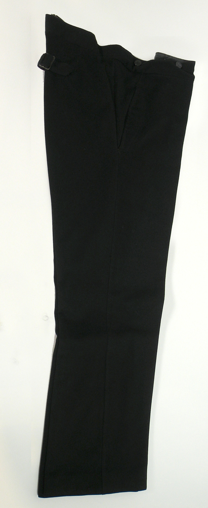 Zwart, wollen herenkostuum, gedragen als trouwpak