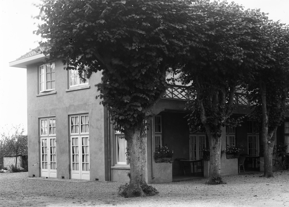 De zijgevel met pergola van hotel-pension De Zwaan i...