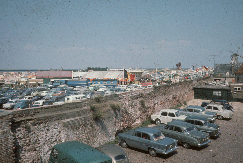 Strandboulevard met kermis en geparkeerde auto's