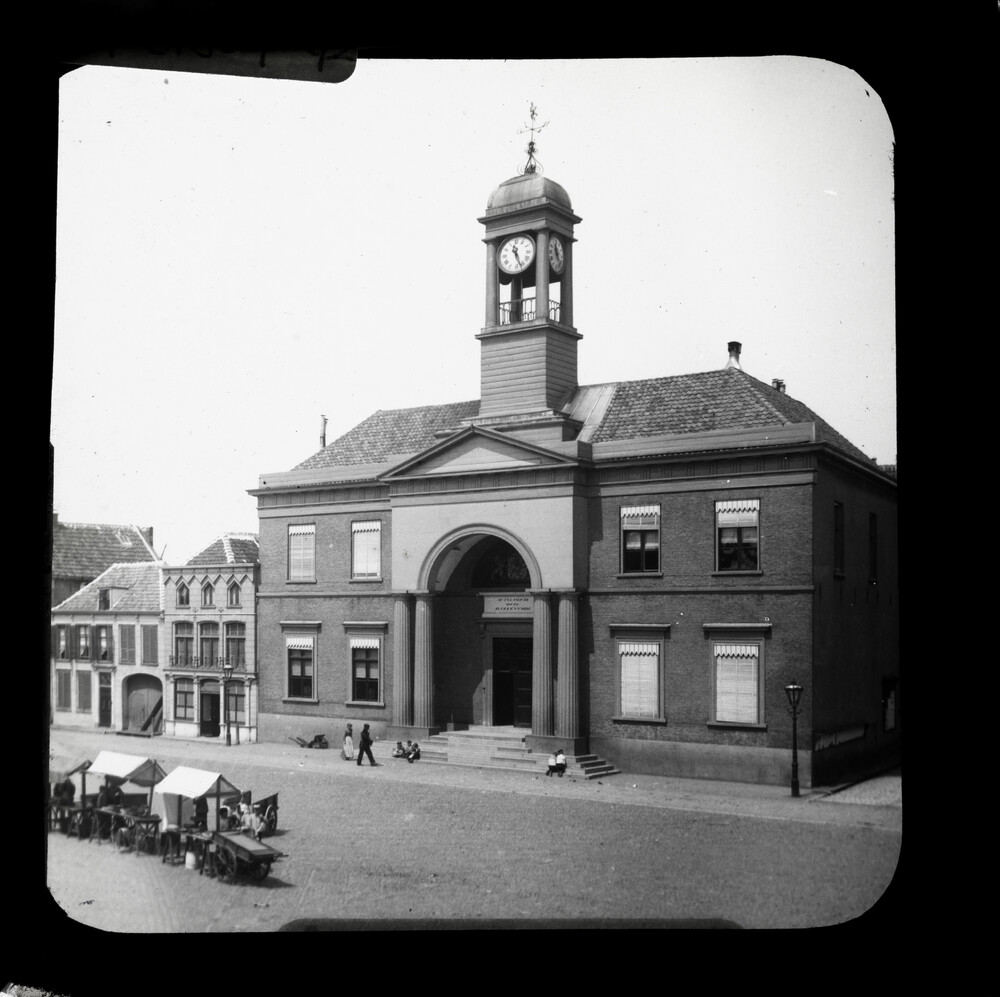 Markt met stadhuis en enkele kramen
