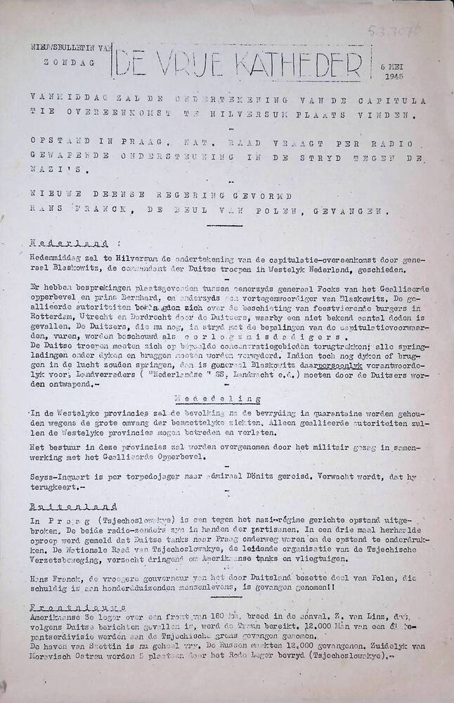 De Vrije Katheder ( Nieuws bulletin), 6 Mei 1945