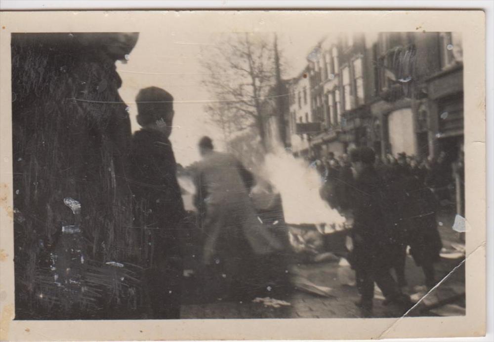 Foto van vuur op straat met erom heen mensen. Vooraa...
