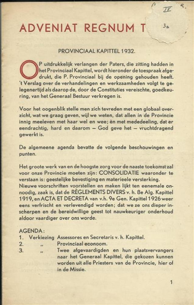 Adventiat Regnum Tuum , provinciaal kapittel 1931